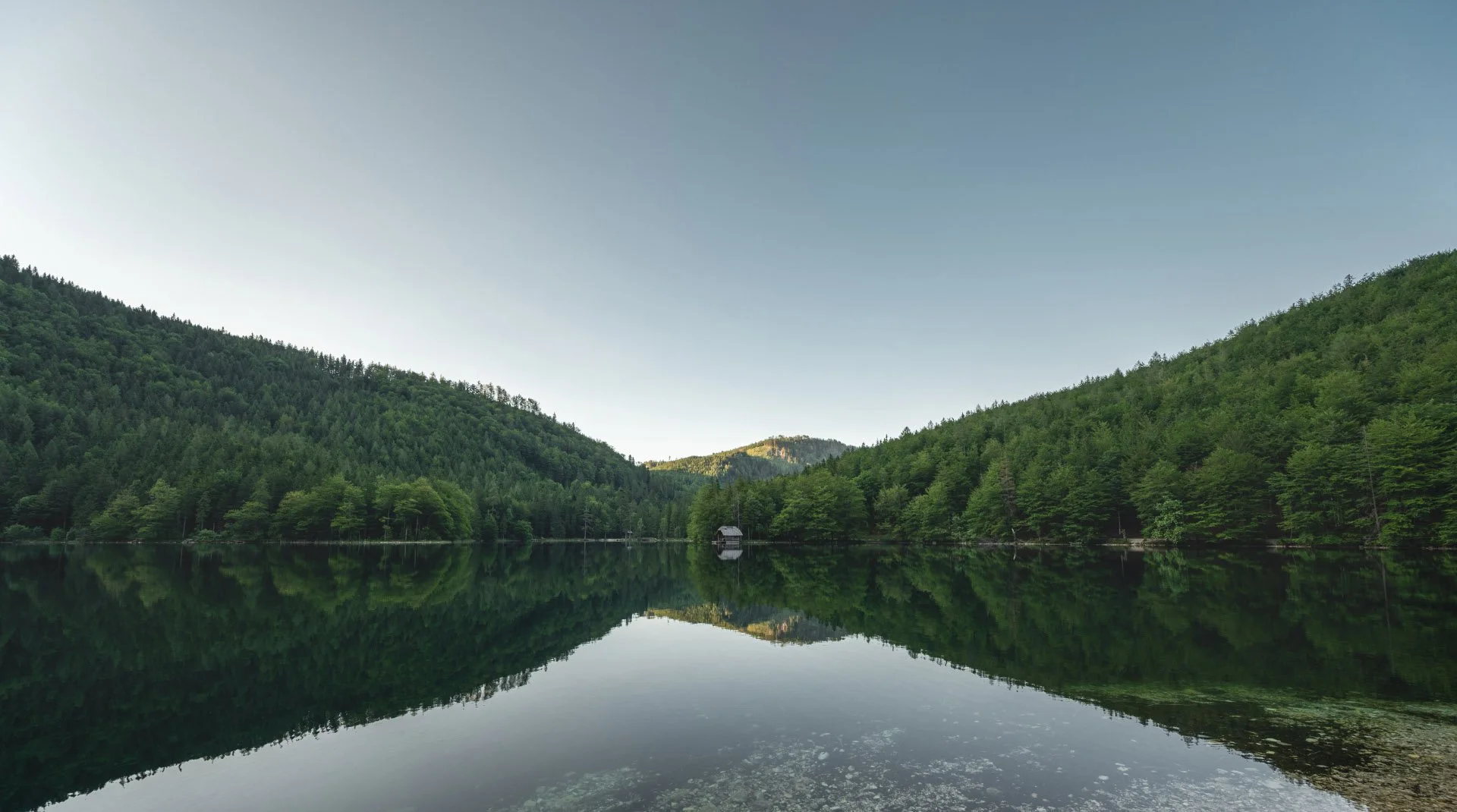 Im klaren Morgenlicht lag der See vollkommen ruhig, nur von den sanften Linien der bewaldeten Hänge begleitet. Ohne spektakuläre Farben oder dramatische Wolken entstand ein minimalistisches Bild, das durch seine Schlichtheit eine fast meditative Ruhe ausstrahlt.